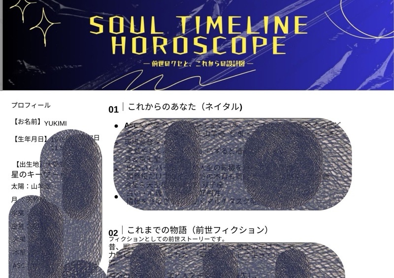 - 内容: あなたのホロスコープ(ネイタルチャート)をもとに、前世をフィクションで表現したストーリーとともに、今世のテーマや意識するべきことをお伝えします。